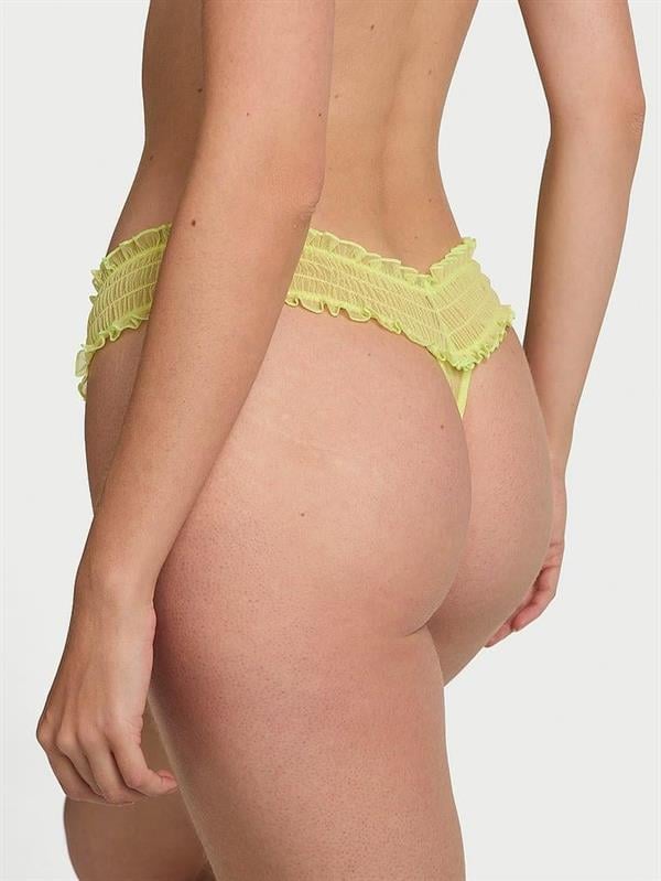 Hafif tül kumaşı ve geniş büzgülü beliyle tasarlanan bu feminen tanga model, iç giyim koleksiyonunuza taze ve romantik bir dokunuş katıyor. Küçük fiyonk detayıyla zarif bir şekilde tamamlanmıştır.