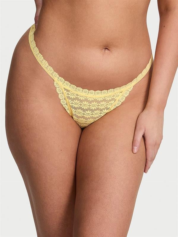 Yeni papatya motifli dantelimiz, iddialı bir görünüm için askılı bel kısmıyla tamamlanan tangayı daha da tatlı hale getiriyor.