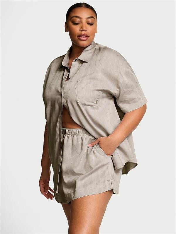 Yumuşak modal-pamuk karışımından üretilen bu klasik pijama takımı, ton sür ton, balık sırtı desen ve ince metalik noktalarla rüya gibi bir tasarıma sahiptir.