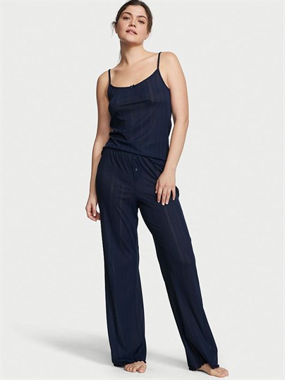 Yumuşak ve hoş pointelle pijama takımı, sıcak geceler veya serin sabahlarda mükemmel bir tercih olarak ön plana çıkıyor. Dalgalı süsleme, bu hafif örgü sete hoş bir hava katıyor.